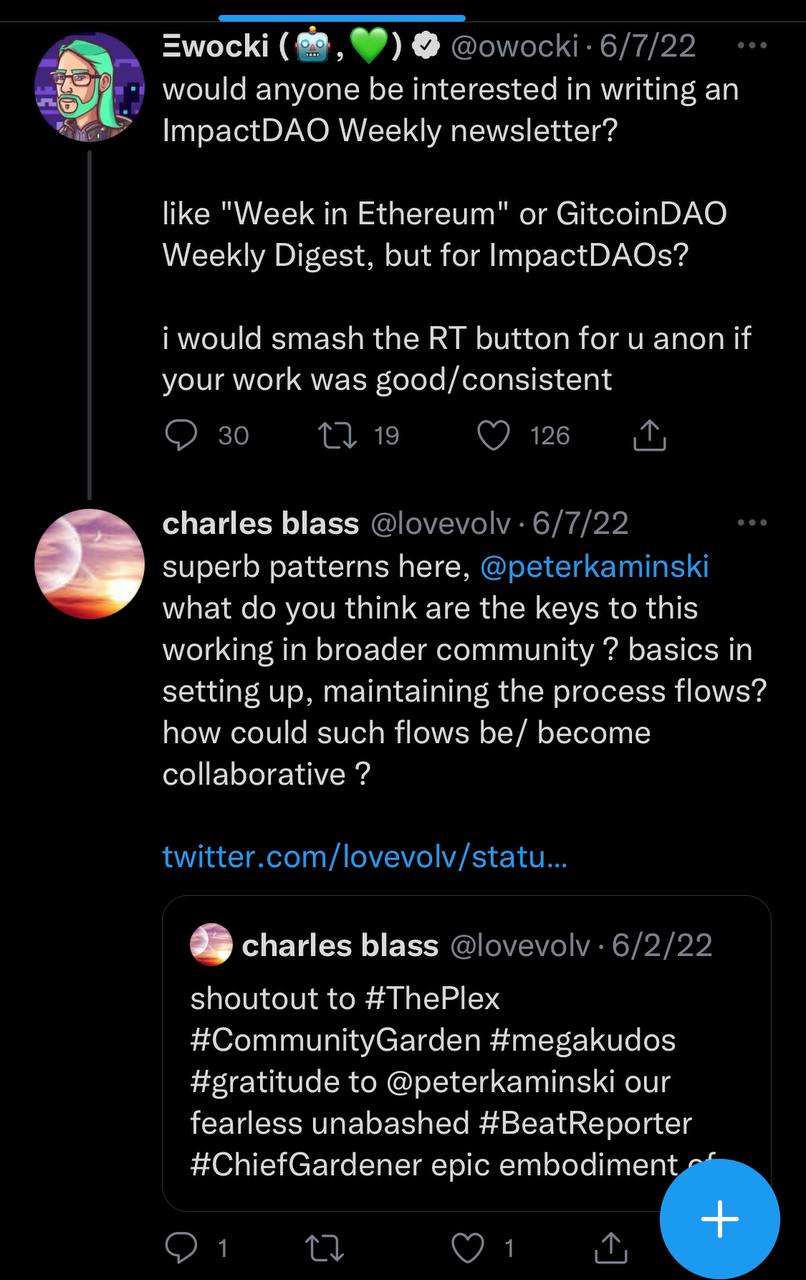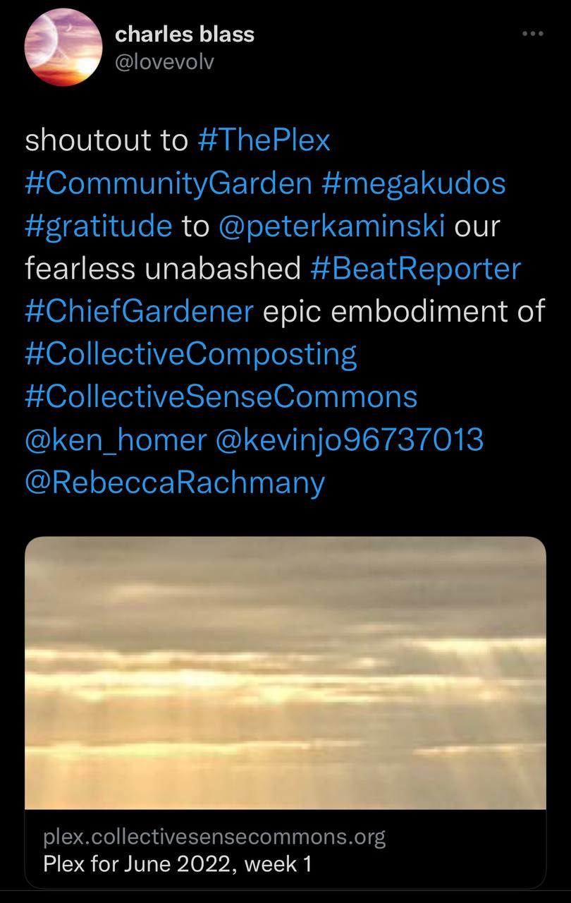 ok i didn’t want this to be so long however i must add something here about the indefatigable peter kaminski and the plex. maybe suffice to say what i said on twitter, plus i invited pete to express the plex process flow in terms of patterns for spreading between communities, such as for the impactdao space, prompted by the open request of kevin owocki of gitcoin. there is definitely a need for this sort of community driven beat reporting everywhere, in every community, though most have no awareness or practice yet. this is so far beyond “newsletter”. the effects for me since its inception have already been profound. and the process is impressive, though not as impressive as pete’s generosity, kindness, patience, foresight, and willingness to go the distance. thank you again peter k!!! when you get around to it pls ask your clone to observe you and thoroughly document the plex process. rinse and repeat 🙌🏼