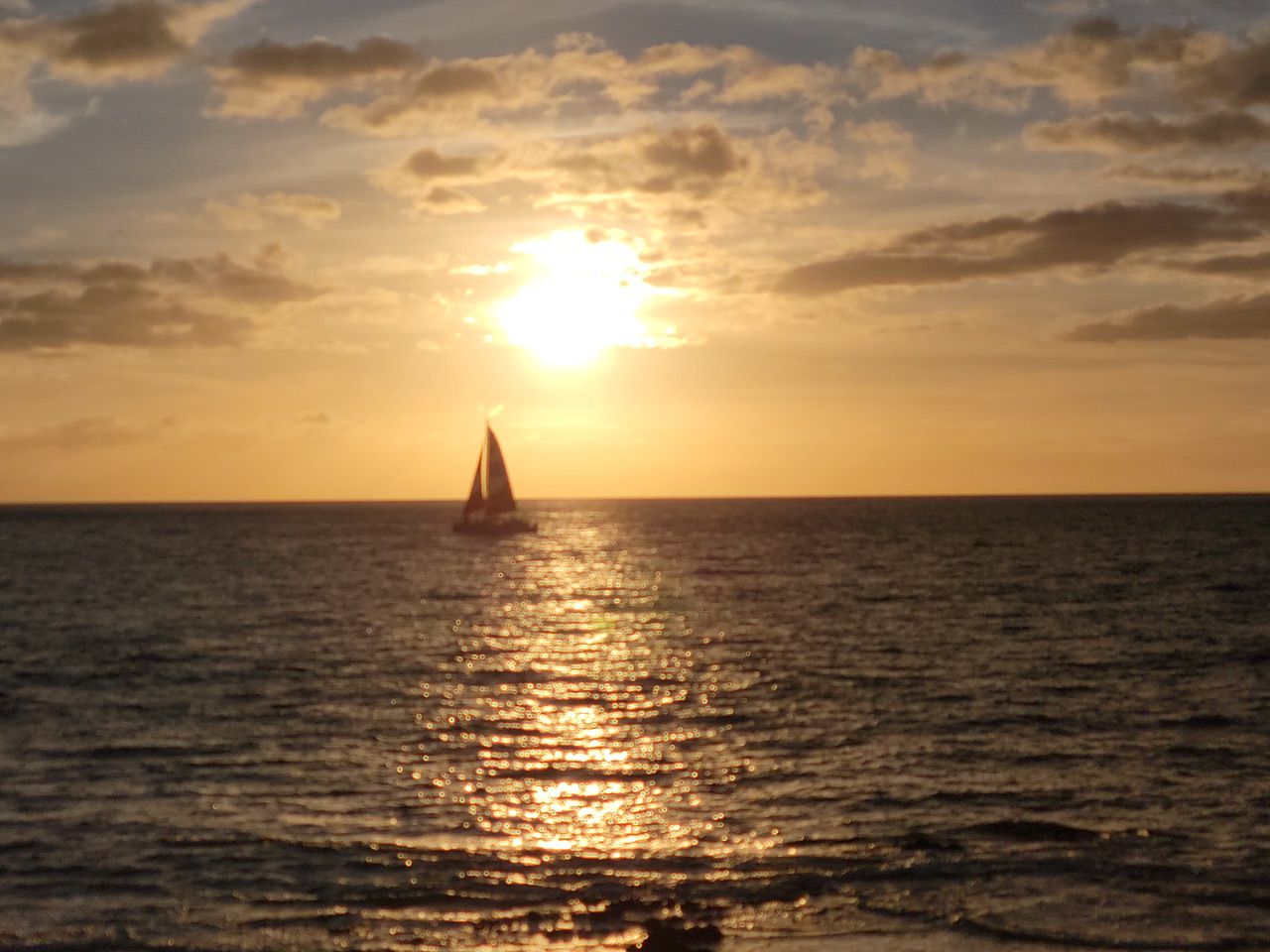 A sunset with sailboat looking towards the Philippines from Kona.