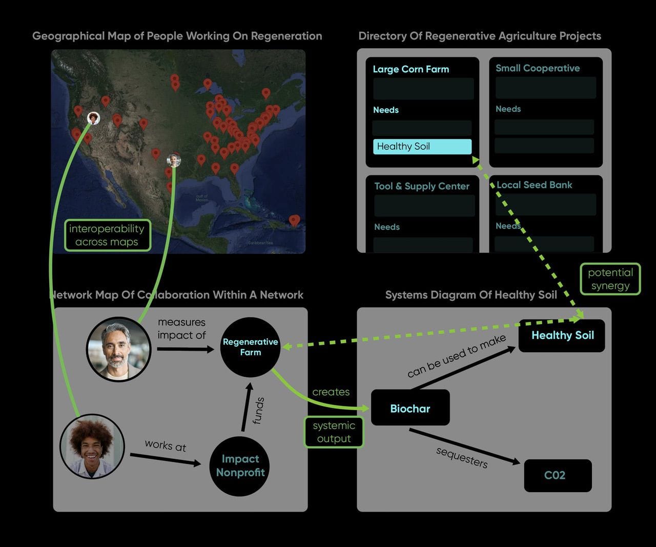 OMNI-Mapping enables small to medium-size non-profit organizations and communities to more effectively achieve their unique goals. Because OMNI-Maps integrate existing data across networks, using the OMNI-Mapping framework unlocks the full potential of any organizations’ existing efforts to enable systemic impact. For example, OMNI-Mapping offers leaders of non-profit organizations access to public data from other people and organizations with similar projects, so they can share solutions and resources in pursuit of their own initiatives. OMNI-Maps empower coordination to better meet challenges across organizations, platforms, and bioregions.